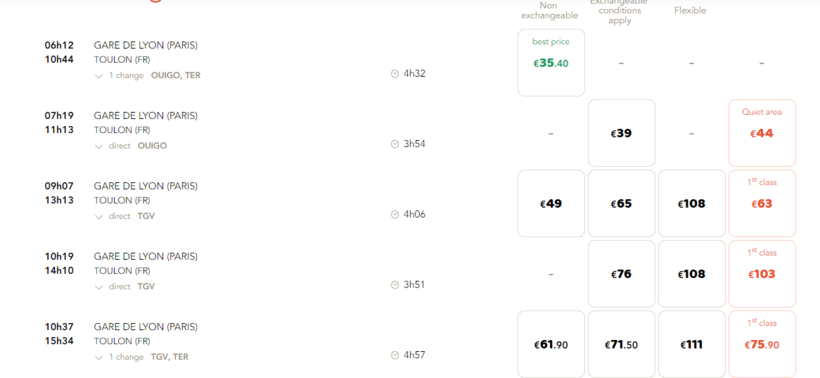 Отправление от Paris-Gare-de-Lyon. Первый поезд отправляется в 06:12, а последний — в 19:37.