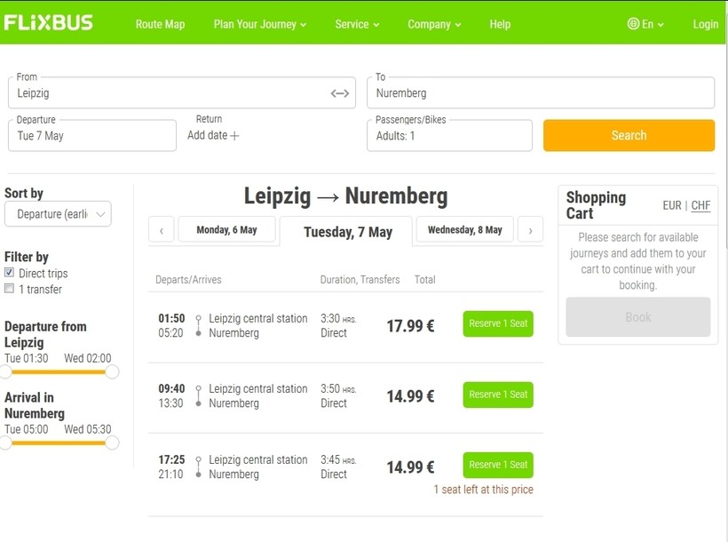 Ниже приведена информация о том, сколько часов вам потребуется, чтобы добраться от Лейпцига до Нюрнберга, а также приведена примерная стоимость проезда (средняя цена билета) на том или ином виде транспорта.