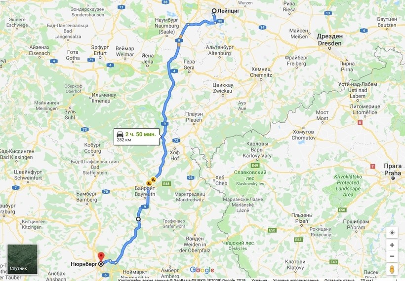 Расстояние между Лейпцигом и Нюрнбергом составляет 142 километра или 88 миль по прямой и 281 километр или 175 миль по автодорогам.