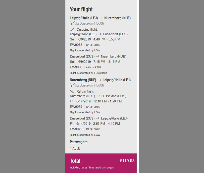 Вылетают самолеты Eurowings из аэропорта Лейпцига. Полет в Дюссельдорф длится примерно 60–75 минут, а из Дюссельдорфа в Нюрнберг еще 60 минут. Посадку самолеты совершают в аэропорту Нюрнберга имени Альбрехта Дюрера.