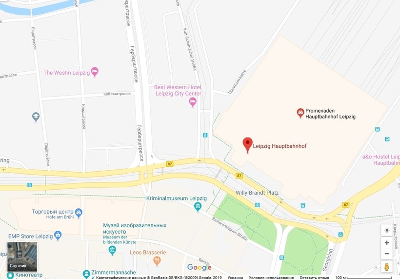 Отправляются поезда от главного железнодорожного вокзала Leipzig Hauptbahnhof на Willy Brandt Platz 7.