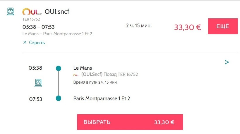 Это удобный и вполне комфортный вариант проезда. На поезде из Ле-Мана в Париж можно попасть два часа с небольшим. На скриншоте ниже один из вариантов.