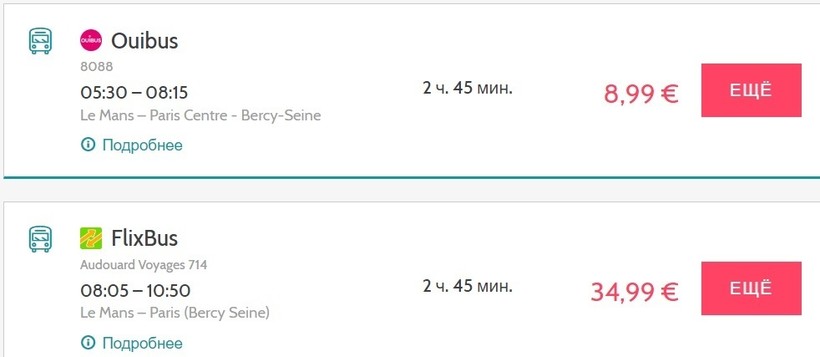 Также есть вариант прокатиться из Ле-Мана в Париж на автобусе. Например, вы можете поехать на автобусе компании Flixbus или компании Ouibus. На скрине несколько вариантов, подробное расписание уточняйте самостоятельно на сайтах перевозчиков.