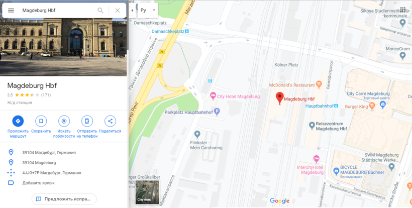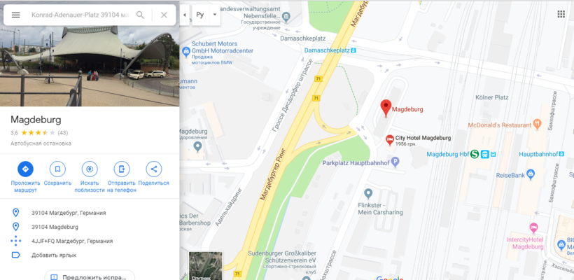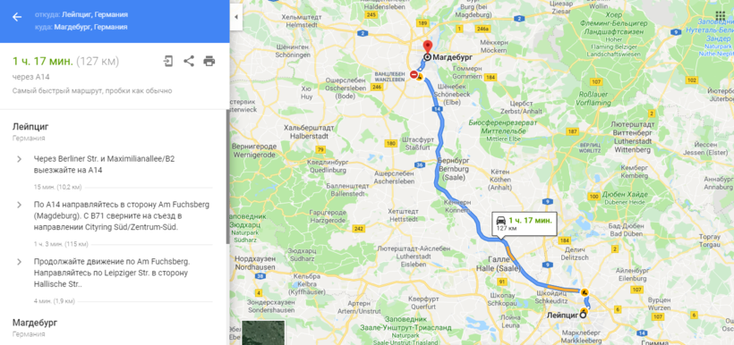 Расстояние до Магдебурга составляет всего 127 км. Их можно проехать примерно за 1,5 часа. Большую часть дороги нужно ехать по трассе А14. Машину в Германии легко взять в аренду. Есть специальные сайты по подбору актуальных вариантов от разных фирм, к примеру, такой. Там можно сравнить цены на аренду у множества прокатных контор, также сразу совершить бронь. Удовольствие поколесить по Германии на арендованной машине будет не из дешевых. Прокат авто обходится от 41 евро (3000 рублей) в сутки и больше. Да и бензин стоит выше среднего по Европе — около 1,53 евро (113 рублей) за литр. Из-за того, что аренда машины обходится дорого для одного туриста, я решила в этот раз ехать на общественном транспорте.