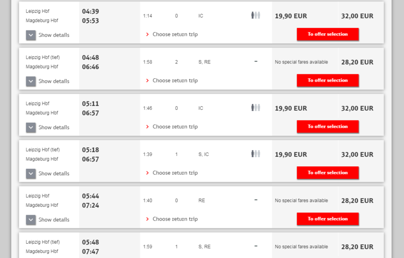 Первый прямой рейс в Магдебург отправляется в 04:39, последний — в 22:18. Ходят они довольно часто, буквально каждые 10–60 минут. Время в пути зависит от категории поезда, на этом маршруте они разные. Доехать можно даже за 1 час 14 минут, но некоторые поезда находятся в пути почти 2 часа.
