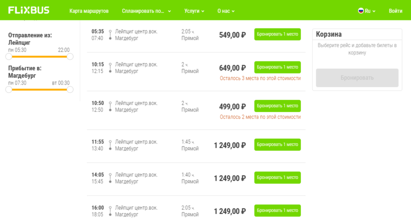 Поэтому во время подготовки к поездке я смотрю прямые рейсы у этой фирмы. В Магдебург выполняется примерно 8–9 рейсов в сутки. Автобусы начинают движение в 05:35, а заканчивают — в 21:55. Интервал в движении разный, от 20 минут до 5 часов. Расписание зависит от дня недели, поэтому смотрите свои даты самостоятельно на сайте фирмы, я ниже дам ссылочку.