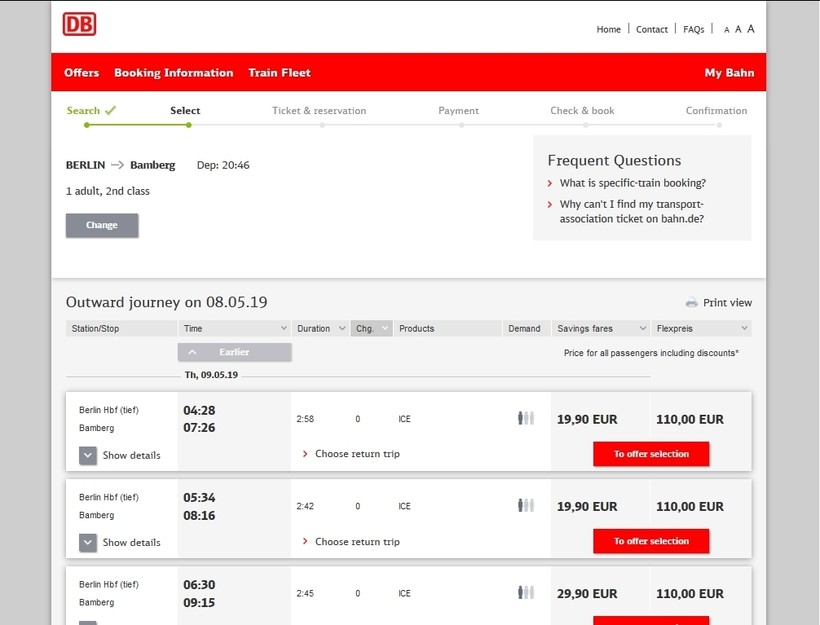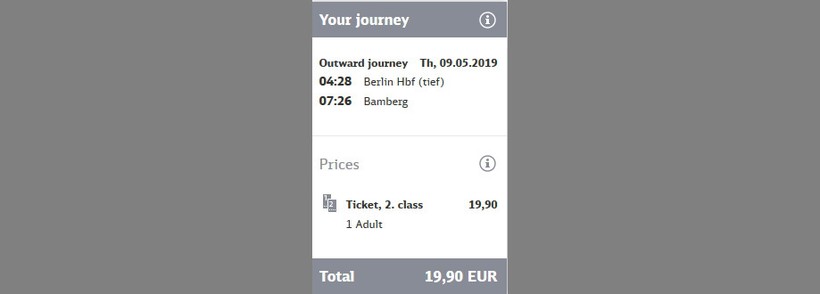 С моей точки зрения, самый удобный, хоть и не самый дешевый способ добраться до Бамберга — это сесть на поезд. Из Берлина в Бамберг поезда ICE идут каждый день начиная с 4:38 утра до 15:37 дня.