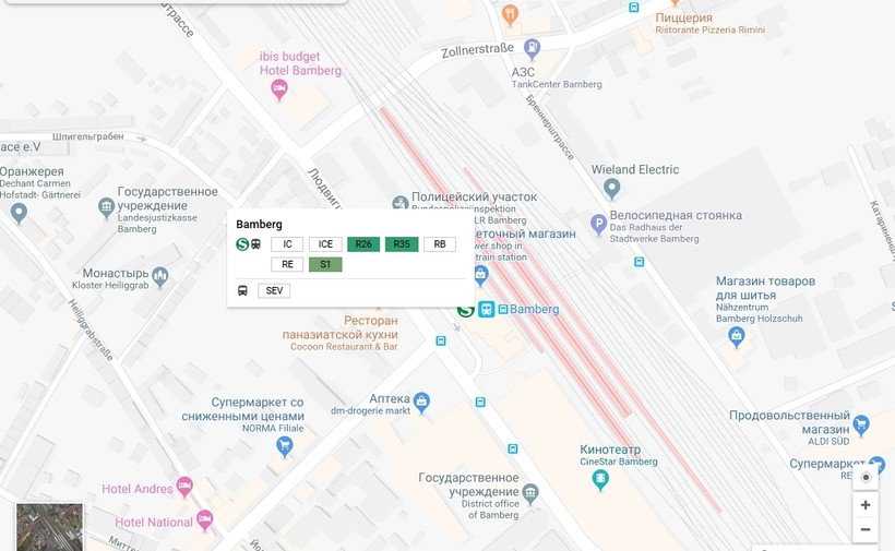 Приходит поезд на железнодорожный вокзал Бамберга (Ludwigstraße 6).