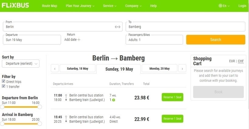 Поездка на автобусе — более дешевый, но и более неудобный способ добраться в Бамберг из Берлина.