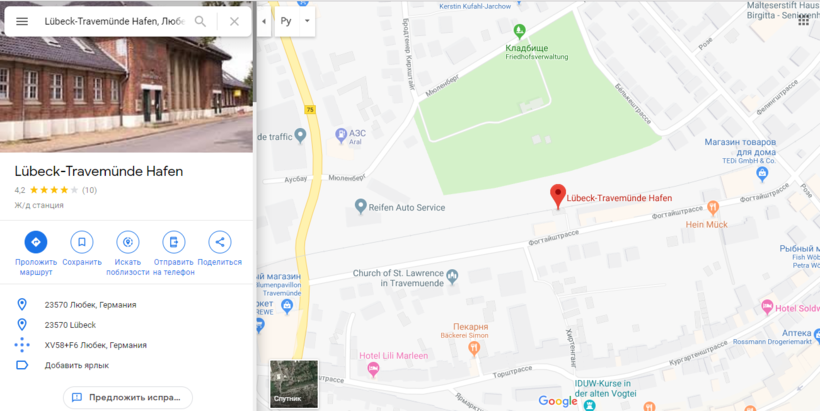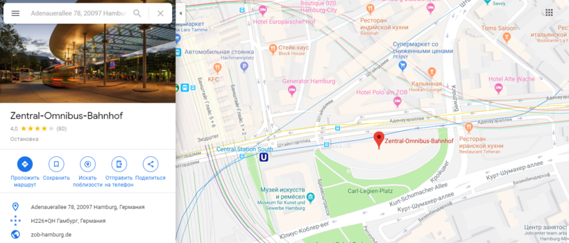 В Любек ехать всего лишь час, а автобусы этого перевозчика супер комфортабельные! В салонах есть розетки, Wi-Fi, кондиционеры и туалет. Прибудете вы на автовокзал Любека, который обозначен на скриншоте.