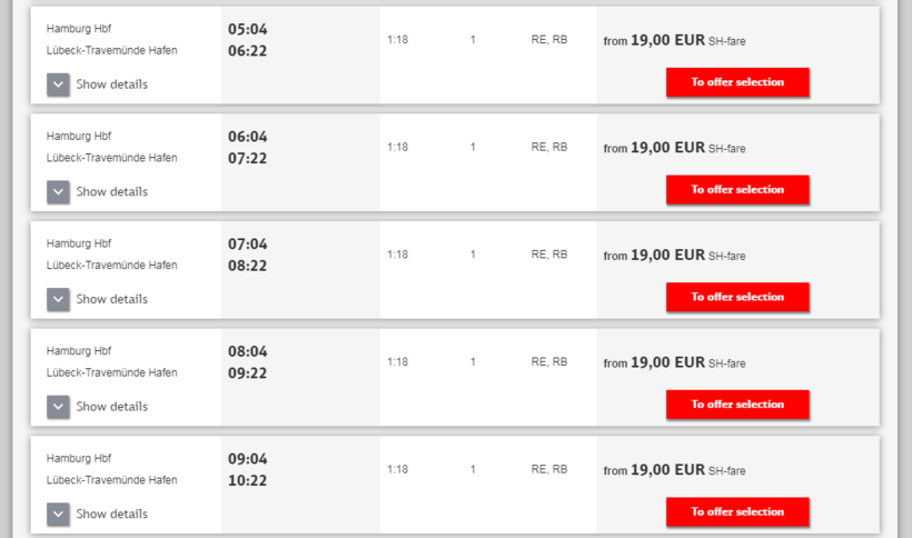 Из Гамбурга ходит много поездов в Любек, где нужно будет пересесть на электричку (о ней я уже выше писала) до Травемюнде. Поезда отправляются каждый час с 05:04 до 22:08.