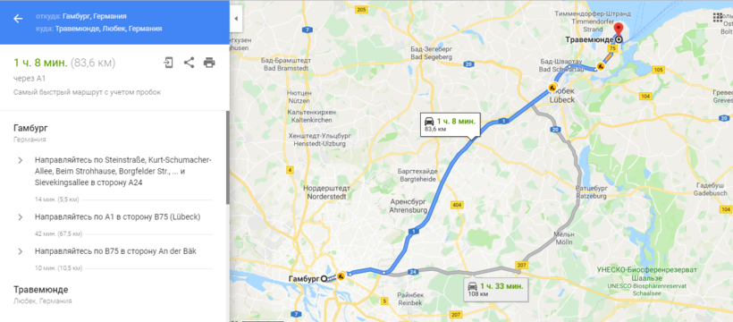 В Травемюнде можно доехать всего за час с небольшим. Придерживайтесь трассы А1 и указателей на Любек. Проехать нужно примерно 85 км. Заправок и мест для перекуса по дороге хватает, с этим все в порядке.