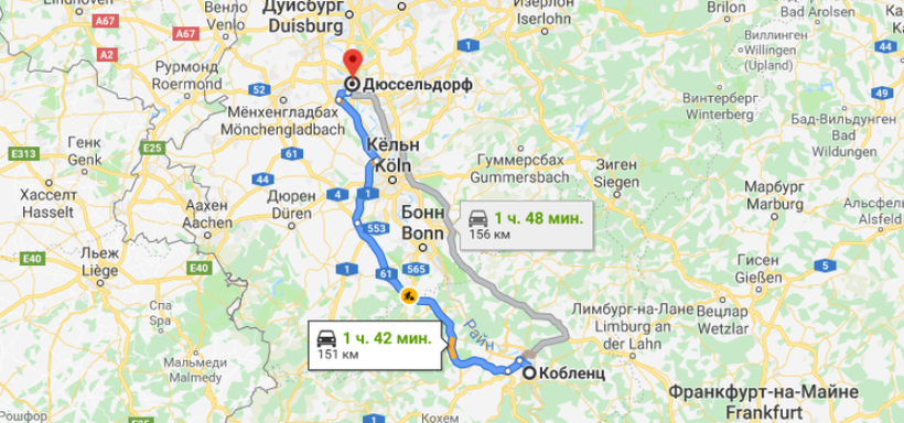 Кобленц и Дюссельдорф разделяют всего 150 км, преодолеть которые за рулем автомобиля по отличным немецким автобанам можно меньше, чем за 2 часа. Арендовать машину в Кобленце, кстати, рекомендую, например, здесь.