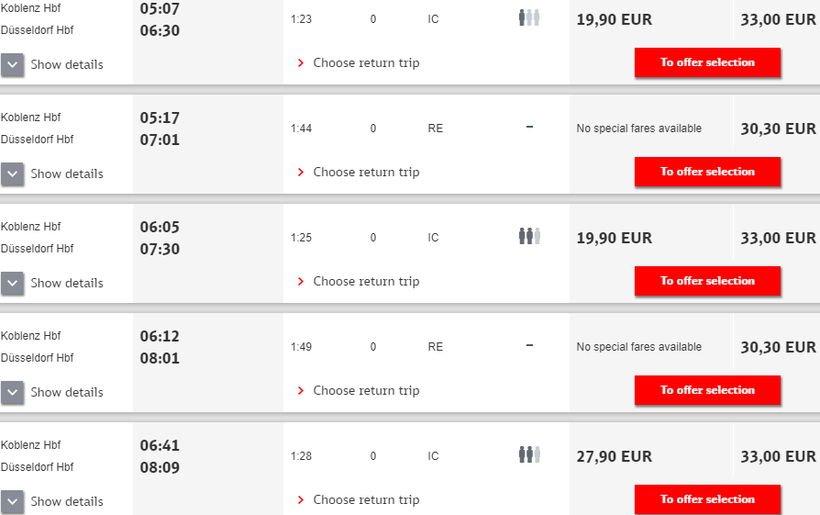 Как я заметила, в Германии минимальная стоимость поездки на поезде — 20 евро или 1440 рублей. Ниже этой цены тарифов нет. Это касается и маршрута Кобленц — Дюссельдорф — на поезда Intercity билеты стоят от 20 евро, а на Regional Train — от 30,30 евро (2200 рублей)