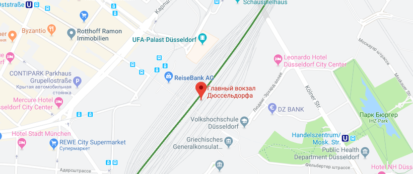 В Дюссельдорф поезда прибывают на центральный ж/д вокзал на Konrad-Adenauer-Platz 14.