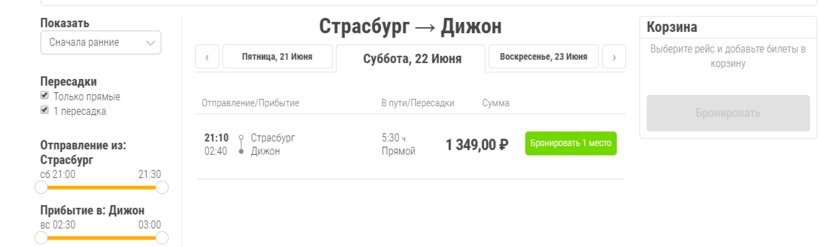 Отправляется автобус в 21:10 от автовокзала в Страсбурге, в Дижоне он будет через 5,5 часов.