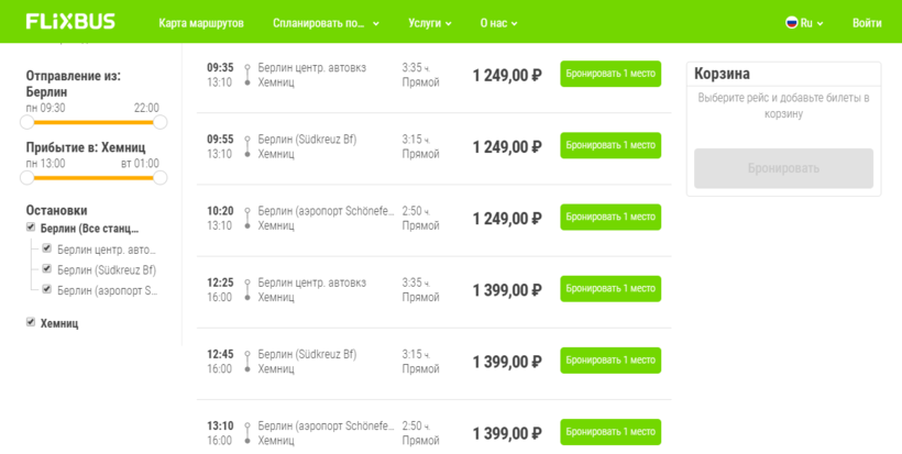 Из-за того, что точки отправления разные, автобус проводит в пути от 2 часов 50 минут до 4 часов 20 минут. Конечная остановка в Хемнице — автовокзал, очень удобно расположенный возле ж/д вокзала. Хочу отметить отличный набор услуг в автобусах этого перевозчика — в салоне имеется туалет, кондиционеры, розетки и интернет. За отдельную плату можно приобрести напитки и нехитрый перекус.