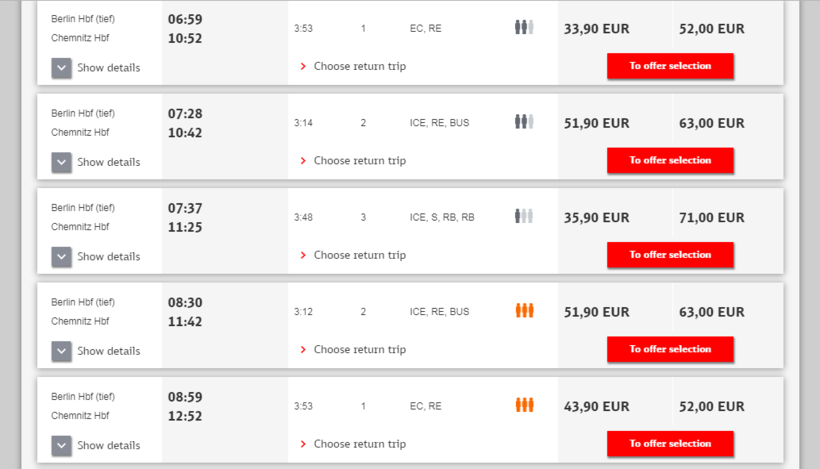 Ниже приведена информация о том, сколько часов вам потребуется, чтобы добраться от Берлина до Хемница, а также приведена примерная стоимость проезда (средняя цена билета) на том или ином виде транспорта.