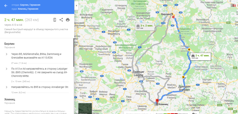 Несомненно, ездить по Германии на машине — это очень удобно. В этой стране столько красивых городов и даже деревушек! А автомобиль предоставляет вам полную свободу действий — можно менять планы по ходу движения и заезжать во все интересные места по дороге. От Берлина до Хемница 265 км. Можно ехать через Лейпциг, но быстрее будет через Дрезден по трассам А13 и А4. Если нигде не останавливаться, можно добраться чуть меньше, чем за 3 часа.