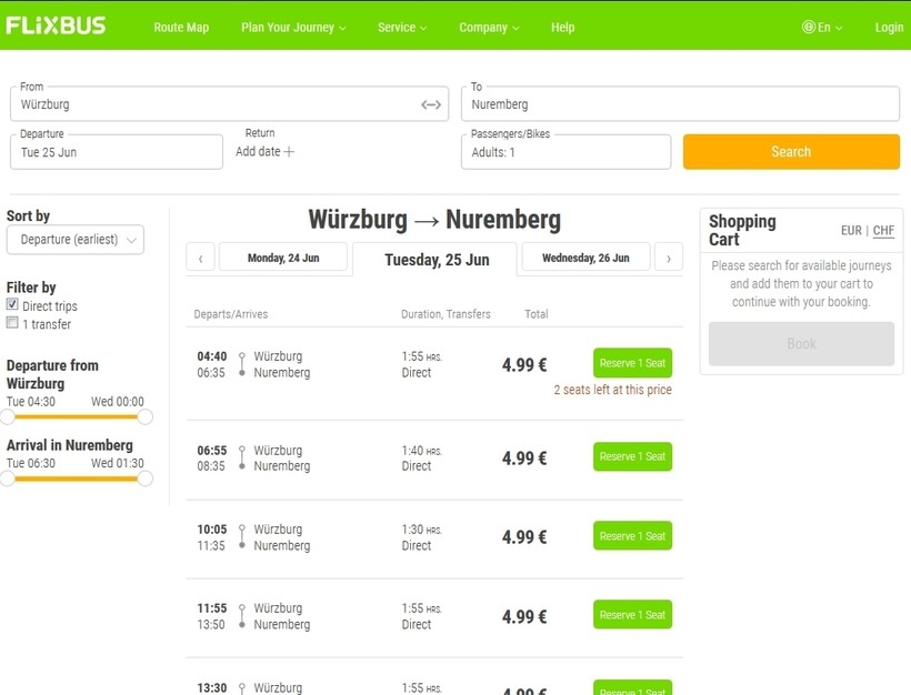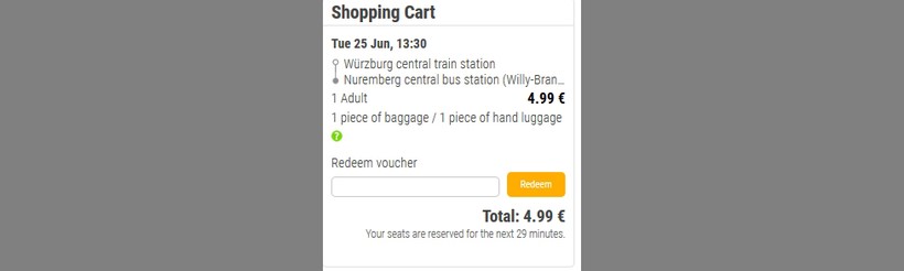 Как я уже говорила, цены у Flixbus бюджетные. Билет на рейс Вюрцбург — Нюрнберг стоит 4,99 € (360 рублей).