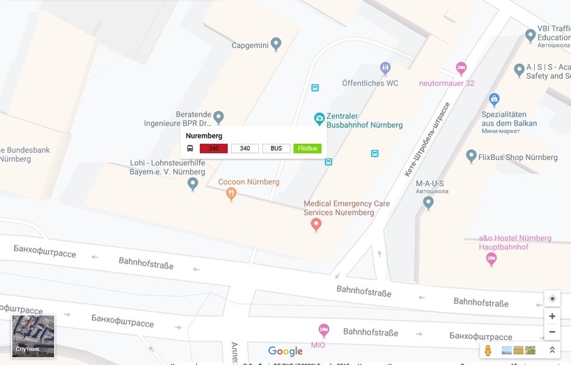 В Нюрнберг автобусы приезжают на остановку Nuremberg на Käte-Strobel-Straße, также очень близко к ж/д вокзалу Нюрнберга.