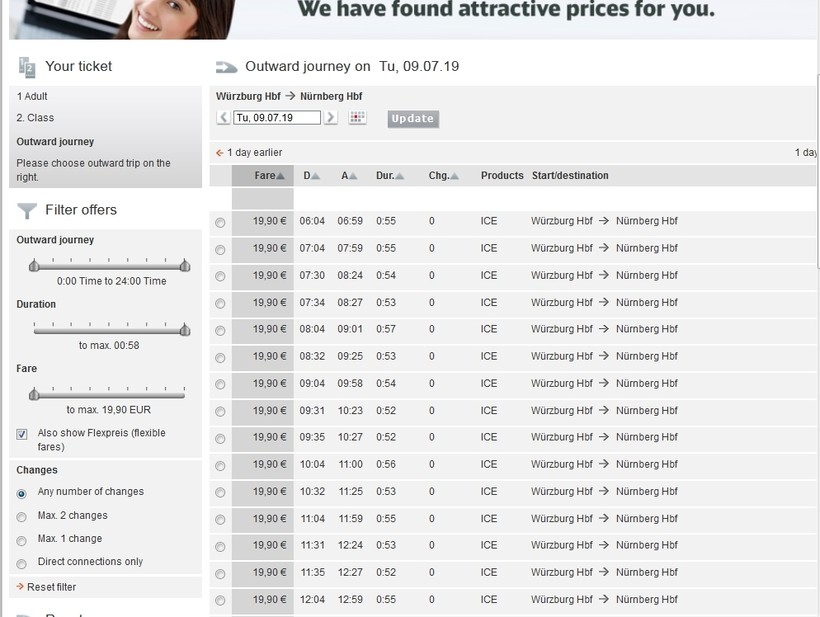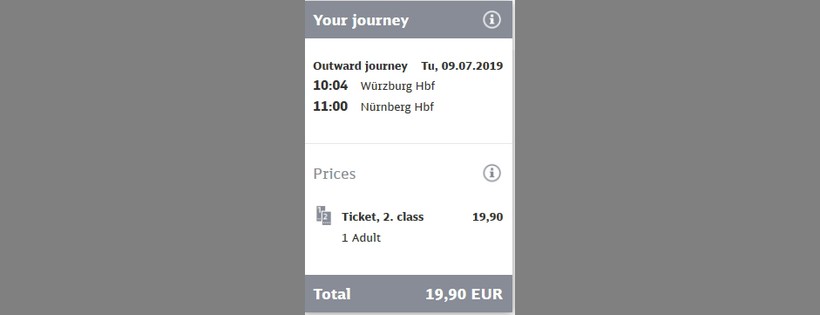 Цена билета на поезд ICE (за 4 недели до поездки) — 19,90 € (1430 рублей).