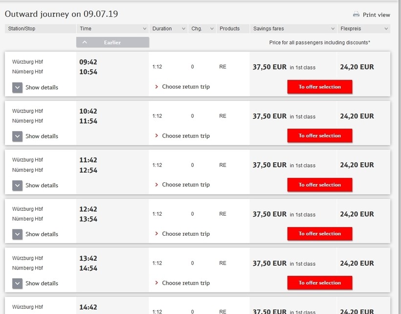 Если ехать на скоростном поезде, то лучше покупать билет заранее. Но можно поехать и на региональном поезде, он также следует прямо в Нюрнберг, правда идет чуть дольше — 1 час 12 минут. Отправление только раз в час.