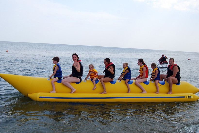 Можно необходимое купить здесь, но турист я небогатый, а цены в самый разгар курортного сезона аховые. Разумеется, от жары отлично спасало море! Вода — парное молоко, вылезать совсем не хотелось! Очень понравились морские развлечения. К гидроциклу привязывают «банан» или «таблетку» и на бешеной скорости мчат в морскую даль, могут и перевернуть! Сумасшедшие эмоции и зашкаливающий адреналин обеспечены! Для любителей спокойных развлечений сдаются катамараны напрокат. Кстати, стоимость развлечений вполне приемлема, даже мне по карману.