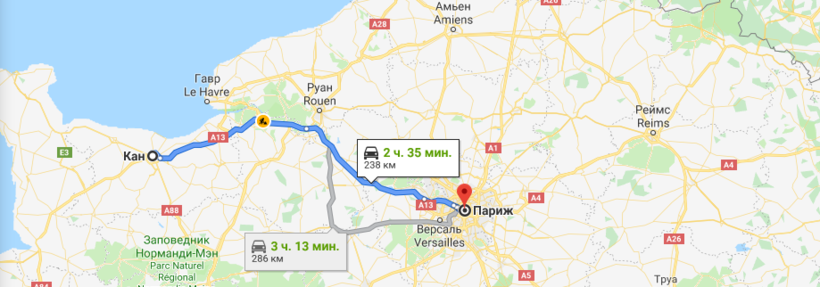 В Париж я приехала на арендованном автомобиле (найти его можно на подобном сайте), поэтому решила, что и для поездки в Кан воспользуюсь автомобилем. Тем более, что расстояние между Парижем и Каном — 240 километров. Я проехала его за 3 часа с небольшим. Можно быстрее, но я не удержалась и выпила кофе на заправке. :)