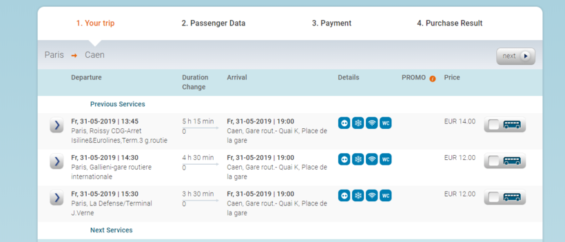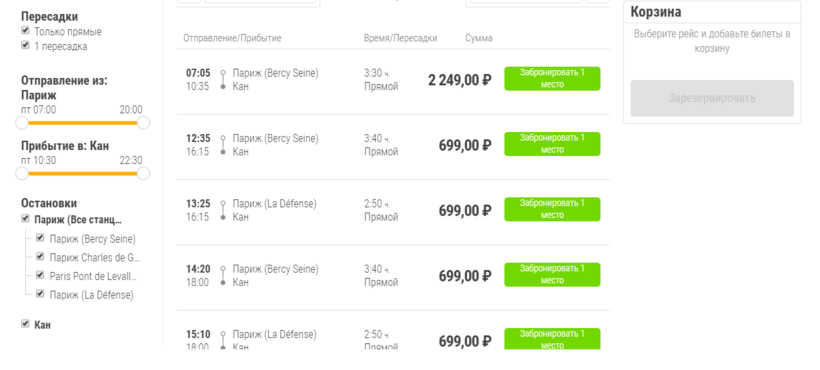 Между Парижем и Каном курсируют автобусы двух крупных европейских перевозчиков. Я гораздо больше люблю Flixbus. Этот перевозчик предлагает дешевые билеты, а его автобусы достаточно комфортабельны. Также мне нравится, что их сайт простой и понятный. Из Парижа в Кан выполняется 8 рейсов в день. Самый ранний рейс отправляется в 07:05, а последний — в 19:45.
