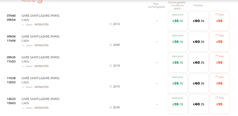 Это фрагмент утреннего расписания, а последний поезд отправляется из Парижа в 20:32. Все они отправляются в Кан от железнодорожного вокзала Paris-Saint-Lazare, который больше похож на какой-нибудь дворец, чем на вокзал. В Кане железнодорожная станция выглядит куда скромнее.Сколько стоит билет