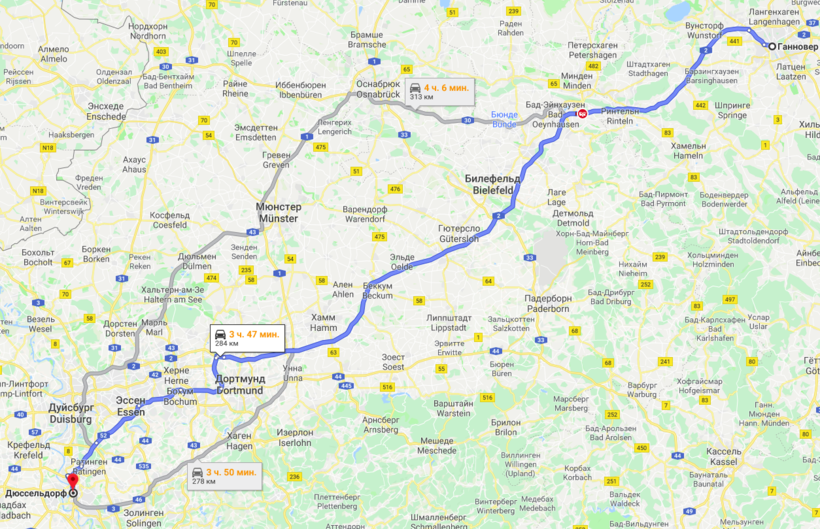 Расстояние между Ганновером и Дюссельдорфом составляет 149 километров или 93 мили по прямой и 277 километров или 172 мили по автодорогам.
