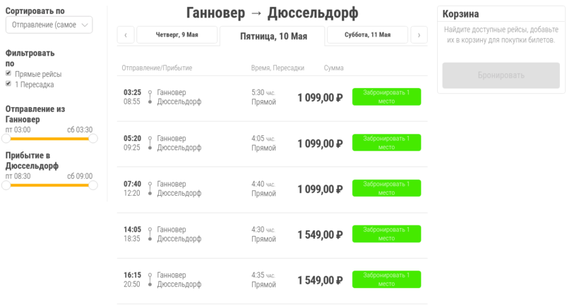 Ниже приведена информация о том, сколько часов вам потребуется, чтобы добраться от Ганновера до Дюссельдорфа, а также приведена примерная стоимость проезда (средняя цена билета) на том или ином виде транспорта.
