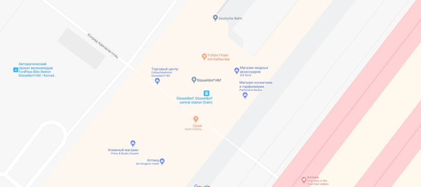 Все поезда прибывают на главный ж/д вокзал в Дюссельдорфе, расположенный по адресу Konrad-Adenauer-Platz 14.