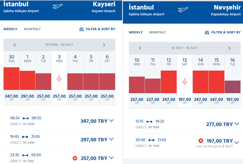Самолеты AnadoluJet вылетают из аэропорта Стамбул имени Сабихи Гёкчен в Невшехир в 13:15 и 20:40, а в Кайсери — в 08:35, 19:45 и 23:35.