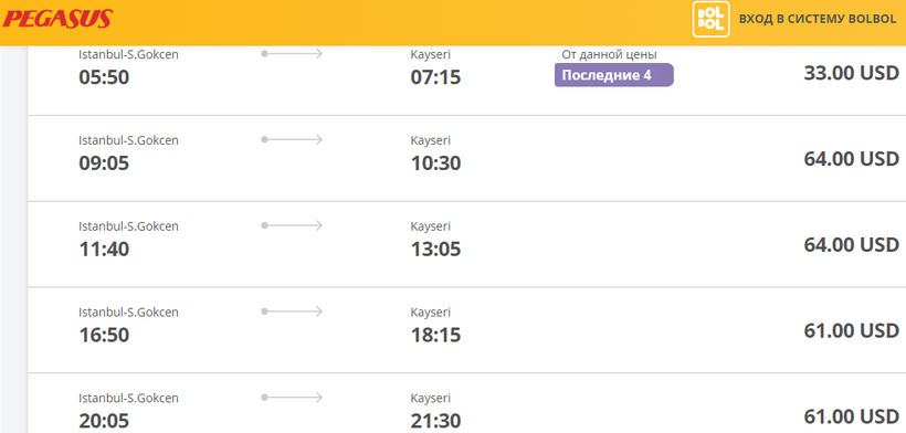 Компания Pegasus Airlines выполняет рейсы только в Кайсери, ее самолеты вылетают в 05:50, 09:05, 11:40, 16:50 и 20:05.