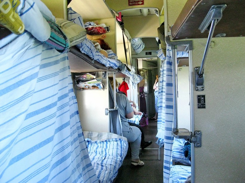 Заполнен вагон был не полностью, даже в плацкарте были свободные места. На уровне третьей полки была перегородка, а на полках имелись ограничители падения.