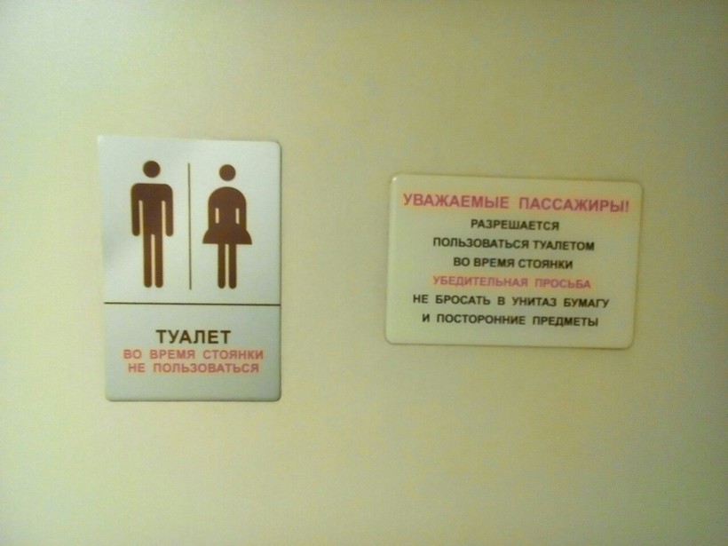 Туалет у нас был в полном порядке, с мылом и бумагой, на стоянках его никто не закрывал. Для любителей бросать в унитаз окурки, бумагу и прочий мусор висела вот такая табличка: