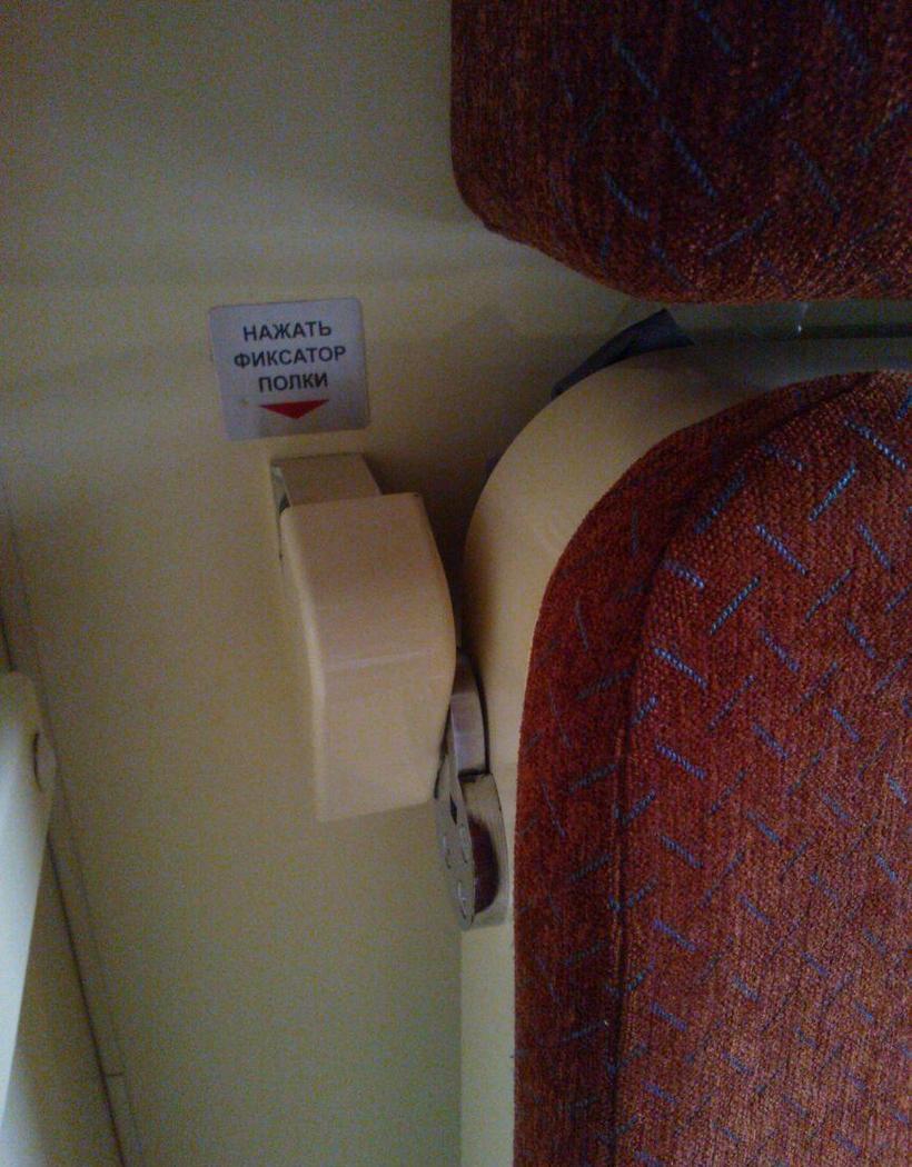 Вагоны тут довольно сильно переделанные. Нижние полки изначально представляют собой диванчики, которые путем нажатия на фиксатор можно превратить в удобные полки. Нажимать нужно вот сюда: