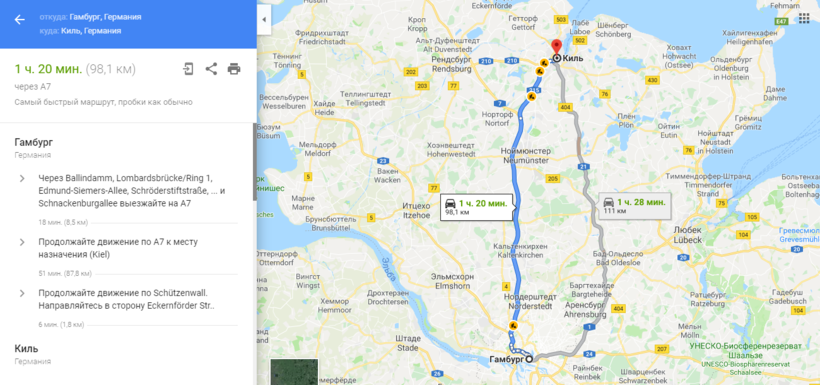 Расстояние от Гамбурга до Киля — около 100 км. На дорогу должно уйти приблизительно 1,5 часа. Основная часть пути проходит по трассе А7. В следующий раз, когда буду в Германии, обязательно возьму машину напрокат. Можно будет останавливаться, где захочется, а ведь по дороге встречается столько всего интересного.