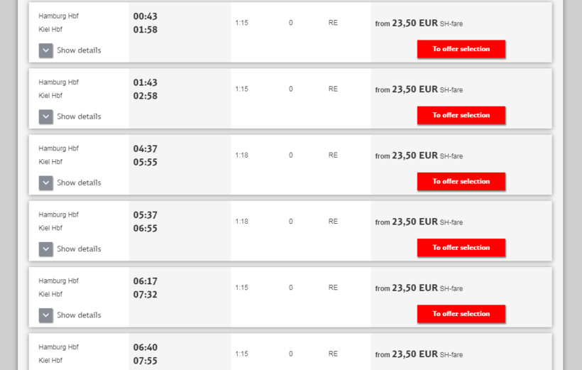 Прямые рейсы поездов есть с 04:37 до 01:43, интервал движения — от получаса до часа. Это очень удобный и быстрый способ добраться в Киль. На этом маршруте ходят поезда с маркировкой RE (Regional-Express) — типа наших электричек, только гораздо цивилизованнее.