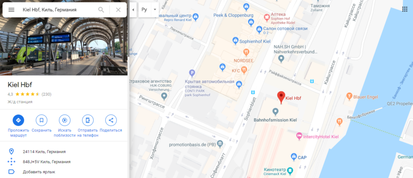А прибывают поезда на железнодорожный вокзал Киля. Он находится всего в километре от порта. Ехать совсем недолго — всего 1 час 15 минут (быстрее даже, чем на машине).