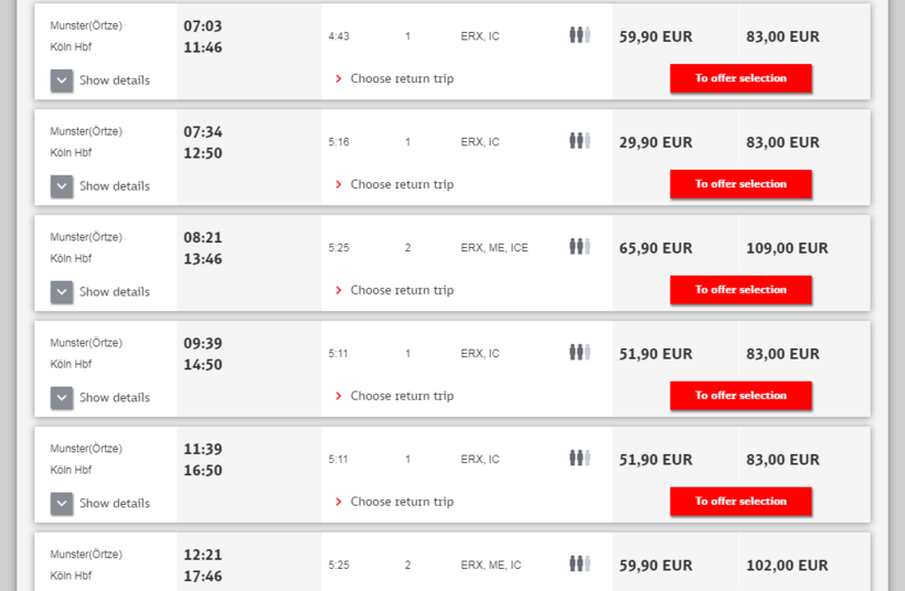 Билет на одну поездку по этому маршруту стоит от 29,90 евро. Вернуть самый дешевый билет нельзя. Поскольку Мюнстер и Кёльн находятся в пределах одной земли, Северный Рейн-Вестфалия, на проезд между ними действует земельный билет. Он актуален сутки на все поезда (второй класс) и общественный транспорт в городах в пределах земли. Стоимость земельного билета на одного пассажира — 31 евро.