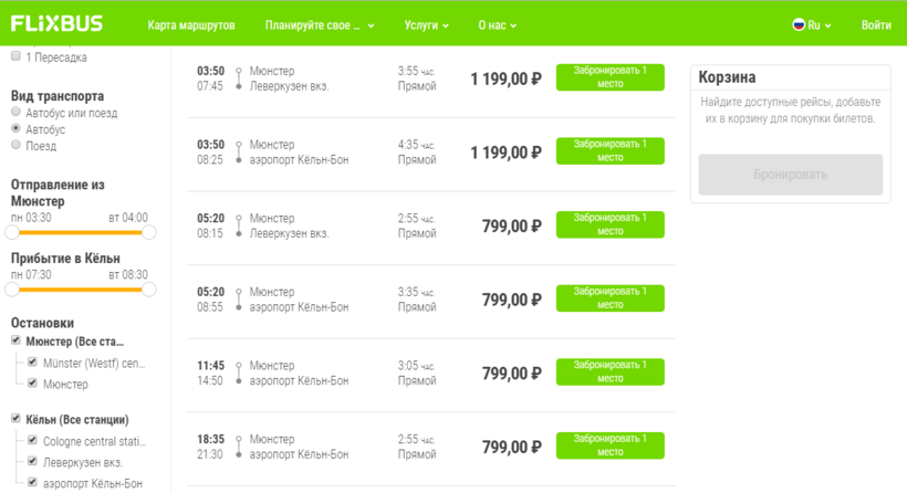 Этот перевозчик довезет вас до Кёльна за 3 часа. Правда, рейс в сутки всего один — в 19:30.