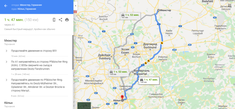 Между городами 150 км, доехать до Кёльна реально за 2 часа. Дороги в стране бесплатные, но вот за въезд во многие города Германии нужно будет заплатить. Кёльн тоже входит в так называемую экозону. В такие города въезжать можно, только предварительно купив эко-наклейку за 5–15 евро, цена зависит от категории автомобиля. Это можно сделать в офисах ADAC или Dekra. Или заказать ее заранее через интернет.