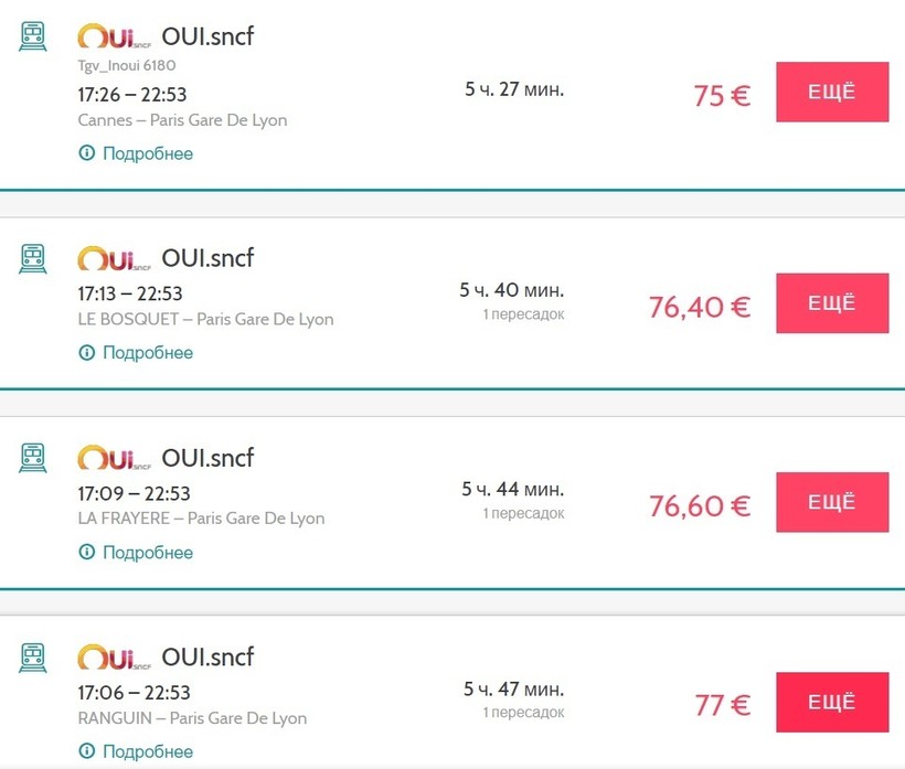 Билет на электричку в Канны стоит от 4 евро (290 рублей), а на поезд в Париж — от 75 евро (5400 рублей).