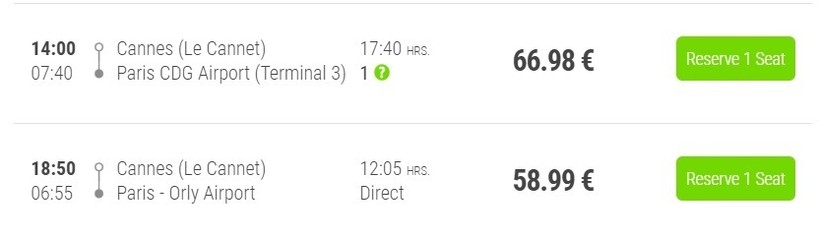 Из Канн в Париж вы может доехать, например, на автобусе компания Flixbus. Ежедневно по этому маршруту выполняется 1–2 рейса. Расписание на конкретную дату уточняйте на сайте компании.