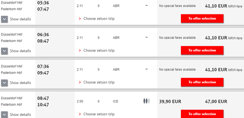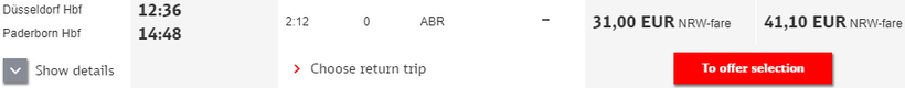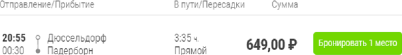 На поезд из Дюссельдорфа в Падерборн (рейс без пересадки) билет стоит от 31 евро (2260 рублей), а на поезда с пересадкой — от 20 евро (почти 1500 рублей).