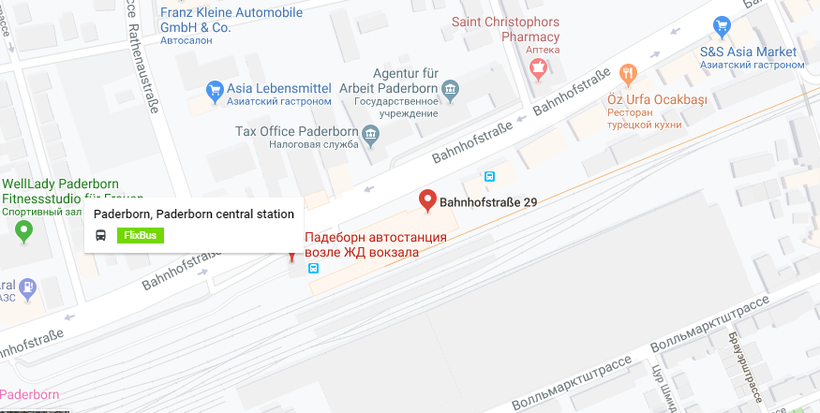 Путь до Падерборна автобусы преодолевают за 3,5 часа, прибывают они на автовокзал на Bahnhofstraße 29, рядом с ж/д вокзалом.