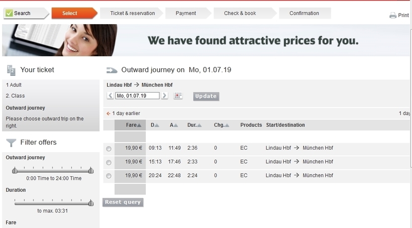 Обычный разовый билет на поезд EC и Bayern Ticket можно купить через сайт немецкого железнодорожного оператора. Также билеты продаются в терминале и в кассах вокзала (нужно будет доплатить 5 € за обслуживание).